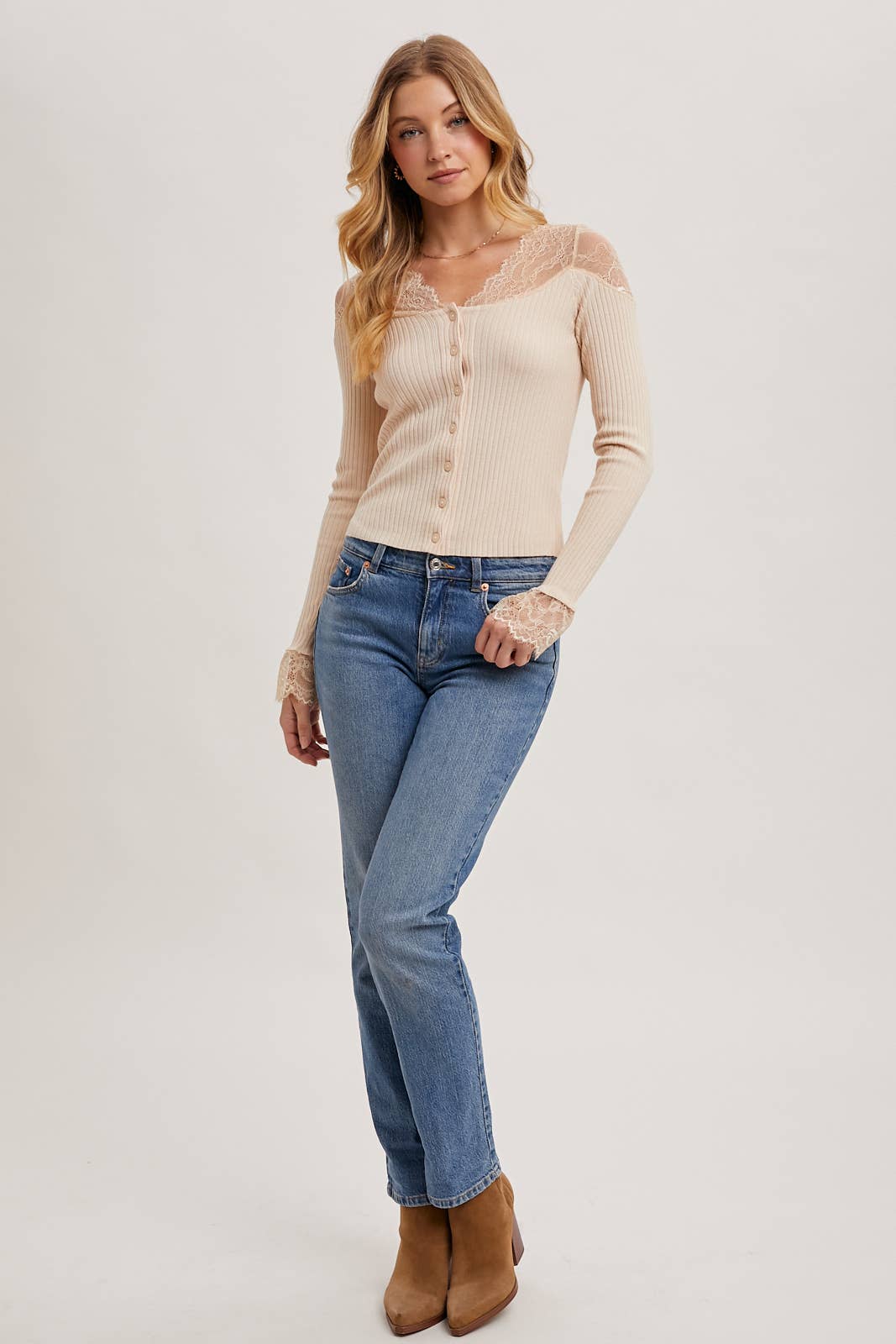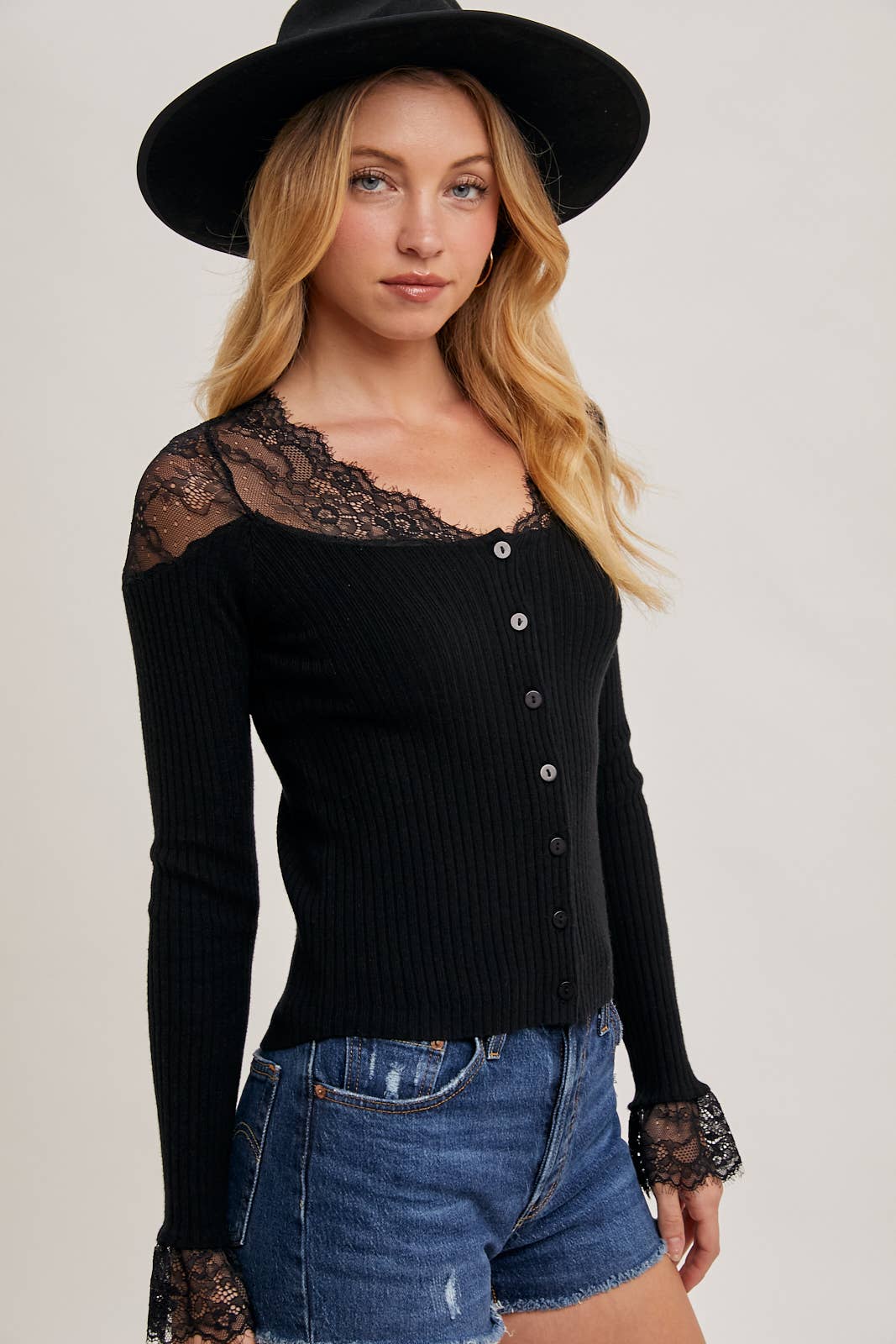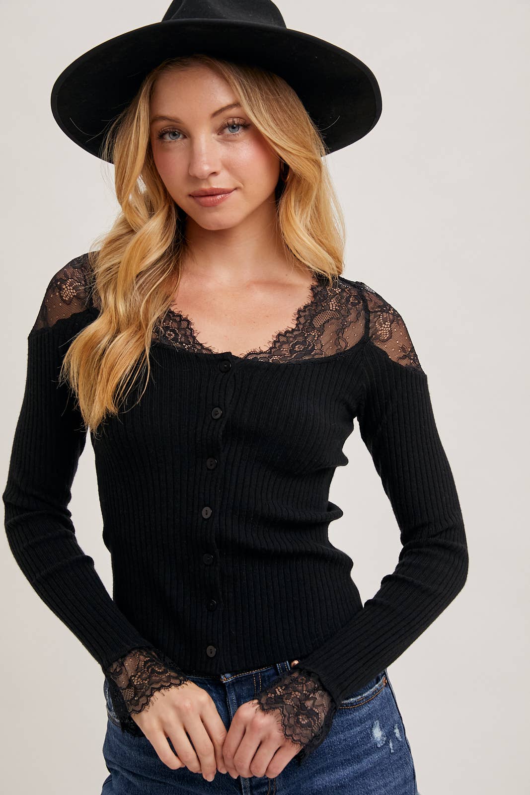 The lace-trimmed button-down knit top offers a blend of elegance and casual comfort. This top features delicate lace detailing along the neckline and button placket, adding a feminine touch to its classic design. The button-down front allows for easy wear, while the knit fabric provides a soft, stretchy fit. Perfect for both casual and semi-formal occasions, this top can be styled with jeans for a laid-back look or dressed up with a skirt for a more sophisticated outfit.