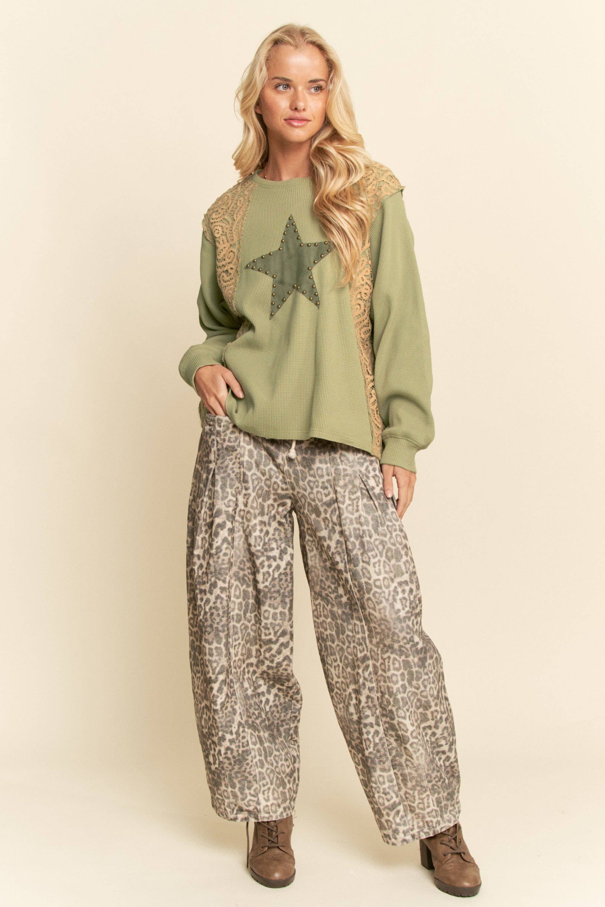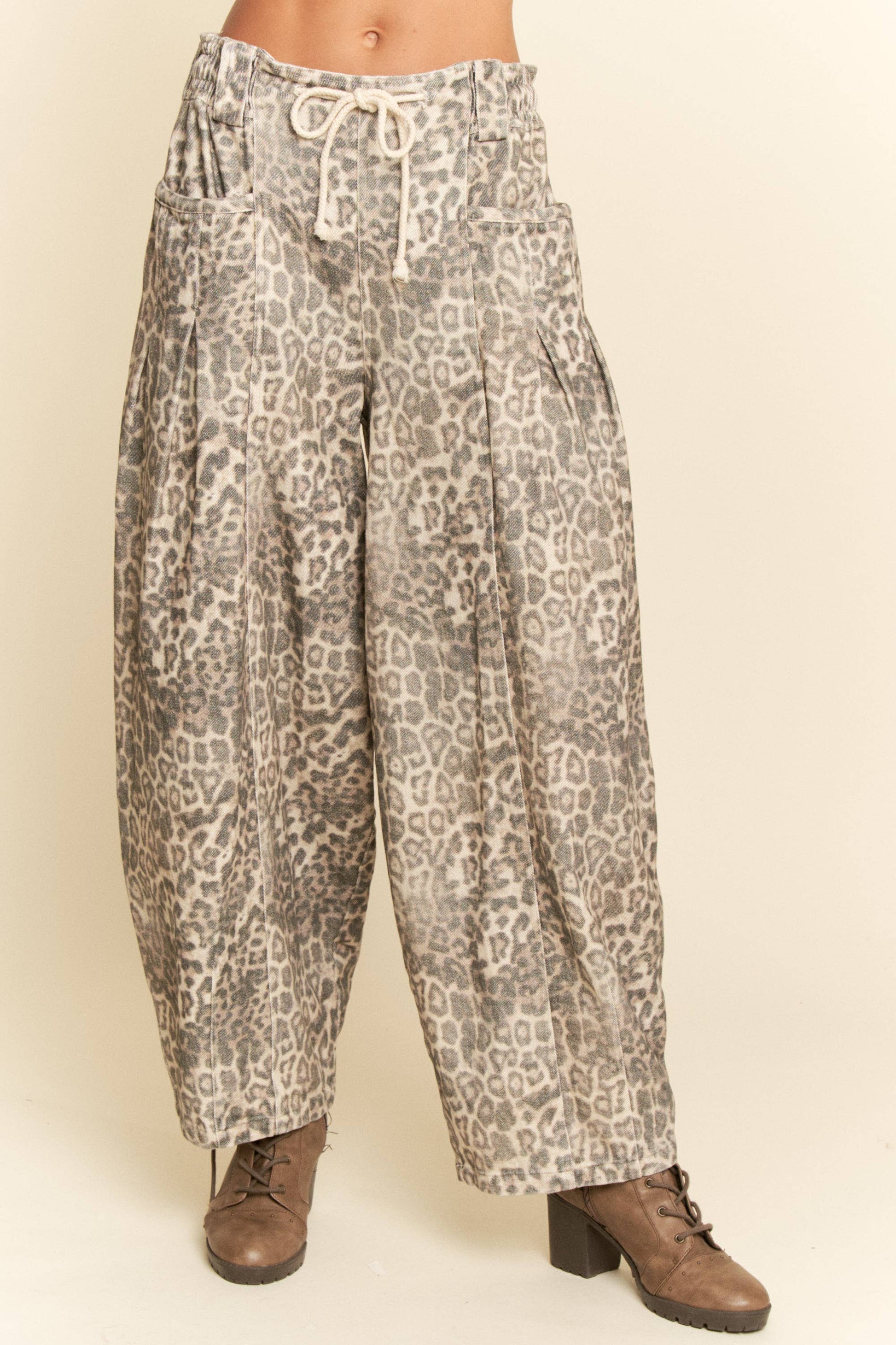 WASHED LEOPARD DEIM ELASTIC AND ADJUSTABLE CORD TIE WAIST PULL ON BARREL JEAN PANTS Model is wearing Small Height: 5'10" Bust : 34 Waist : 25” Hips : 35”